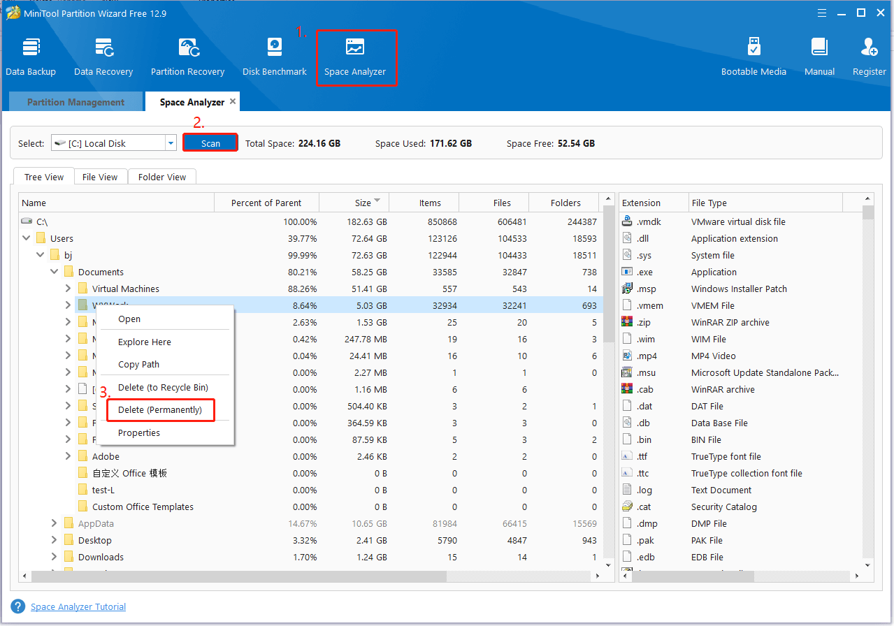 Before trying other methods, you’d better check the actual space on your disk, including the C drive and target drive where the extracted files are stored. If both drives are full, you need to free up disk space on them. How to do that? I highly suggest that you use MiniTool Partition Wizard because it can not only analyze disk space usage but also delete unneeded files permanently.