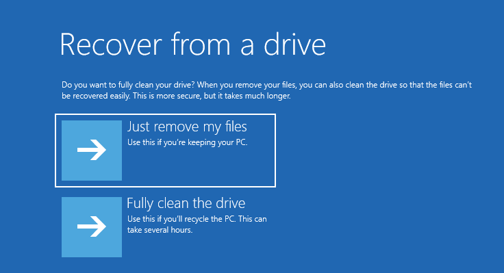 - You will get two options: Just remove my files and Fully clean the drive. Read the warning and click the Recover The recovery process will begin.