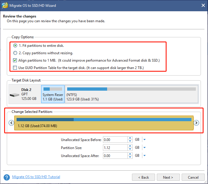 - If the destination disk is smaller than the original disk, please choose copy option 1: Fit partitions to entire disk.