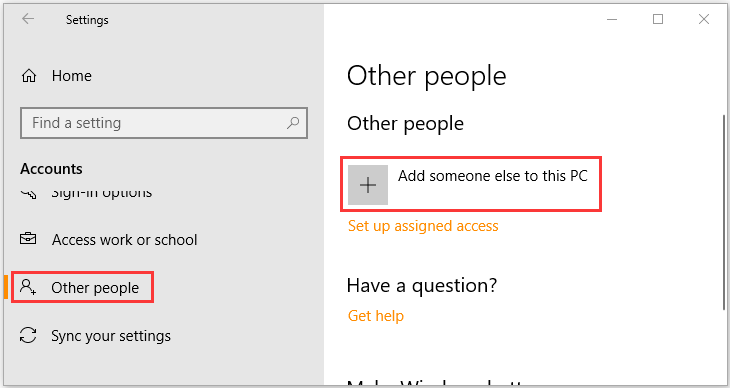 Step 2. Select the Other people or Other user option from the left pane and click on Add someone else to this PC from the right-side pane.