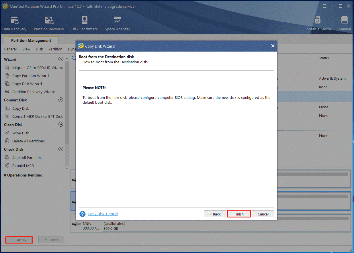 Step 4. Read the information and click the Finish button in the pop-up window. Then click Apply to execute the pending operations.