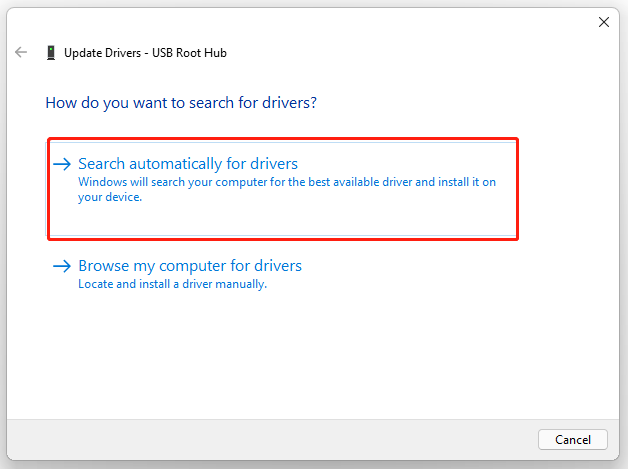 Step 3. Select Search automatically for drivers option and follow the on-screen instructions to update the driver automatically. Then repeat these steps to update all USB controller drivers.