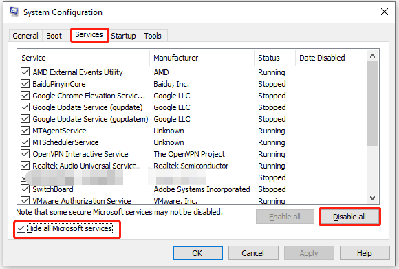 Step 3: Tap on the Services tab, tick the Hide all Microsoft services option, and click Disable all.