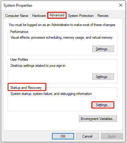 Step 4: Navigate to the Advanced tab and then click Settings under Startup and Recovery section.