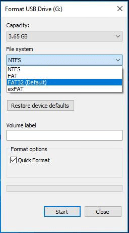 Step 2: In the format window, choose the desired File system, Allocation unit size, and Volume label. Then click Start.