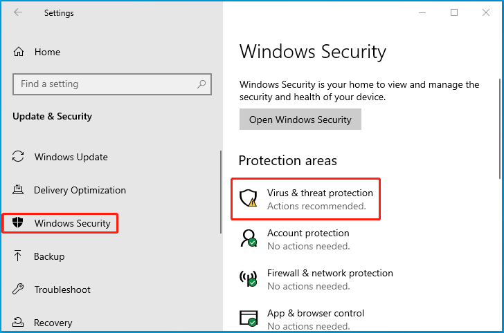 Step 2: Go to Windows Security and then click Virus & threat protection from the right side.
