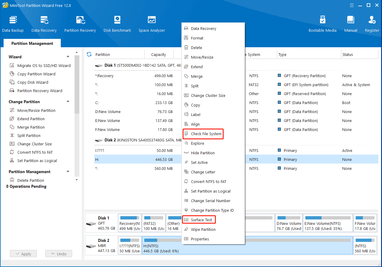 To check your hard drive with MiniTool Partition Wizard, you can download and install this program on your PC. Then launch it to enter the main interface and right-click the target partition to select Check File System or Surface Test. After that, follow the given instructions to complete the disk checking.