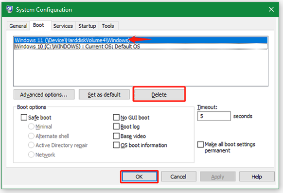 Step 2. In the System Configuration window, navigate to the Boot tab, select Windows 11 OS from the list, and click on Delete.