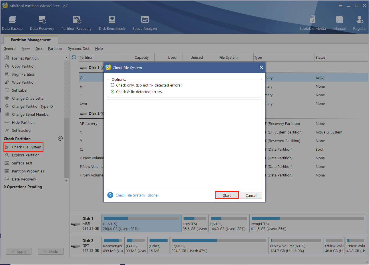 Step 4. In the pop-up window, select the Check & fix detected errors option and click on Start to begin the repair.