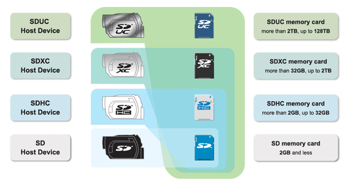 Just as the above picture shows, SDUC memory cards must only be used with SDUC Host Devices; SDXC memory cards can be used with SDXC devices and SDUC Host Devices; SDHC memory cards can be used with SDHC devices, SDXC devices and SDUC Host Devices; SD memory cards can be used with SD devices, SDHC devices, SDXC devices and SDUC Host Devices.