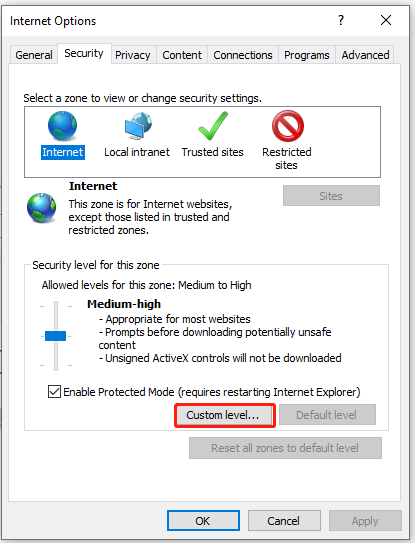 Step 2. In the pop-up window, navigate to the Security tab and click on Custom Level.