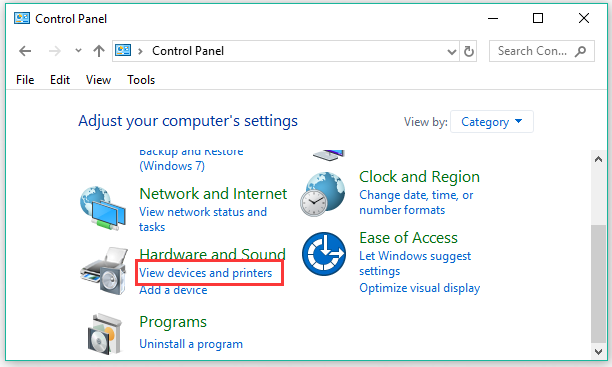 Step 2. Change the View by to Category, and then click on View devices and printers under the Hardware and Sound section.