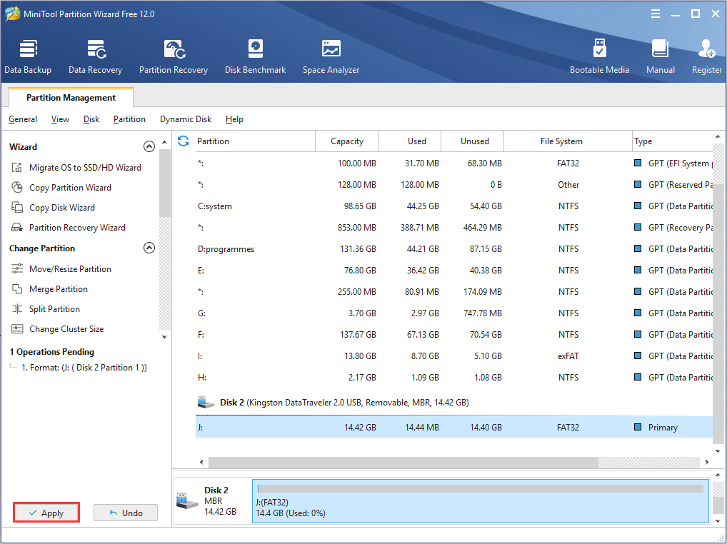 - MiniTool Partition Wizard: Multilingual support and can format large USB to FAT32 as well as format USB drives to EXT2/3/4 on Windows PCs.