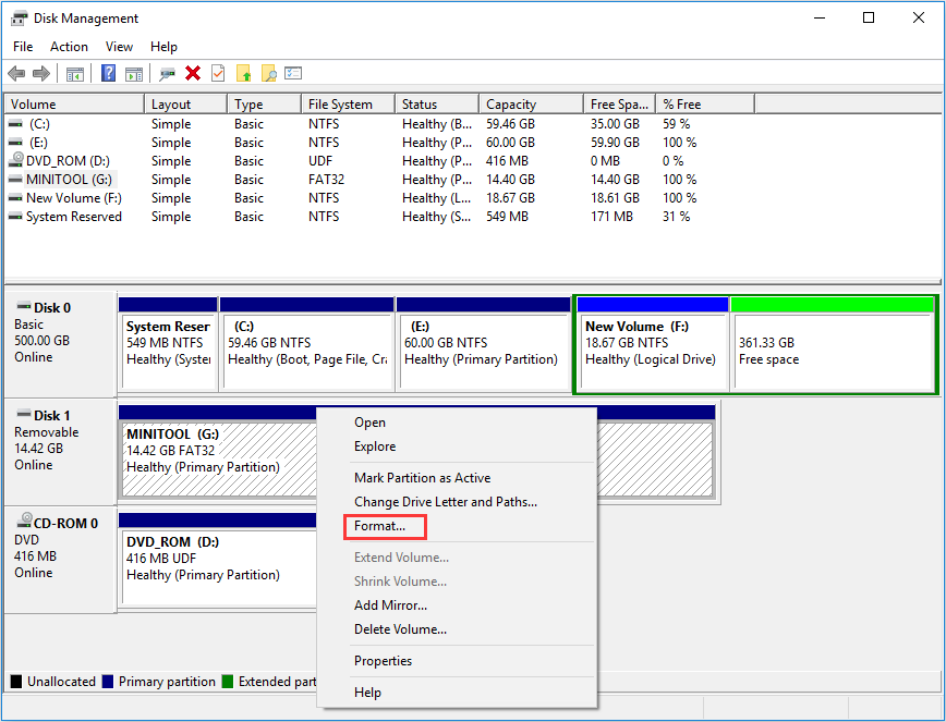 - Right-click the partition on the USB flash drive and select Format from the menu.