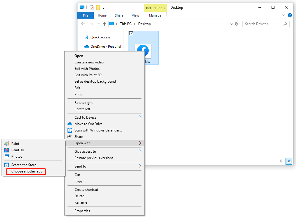 Step 3: After right-clicking your target, you are supposed to scroll down your mouse to the Open with, and choose the option of Choose another app.