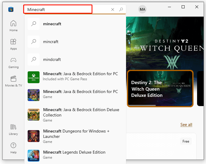 Step 2. In the Store, search for Minecraft via the top sear bar and select the Minecraft version that you want to get from the list of results.