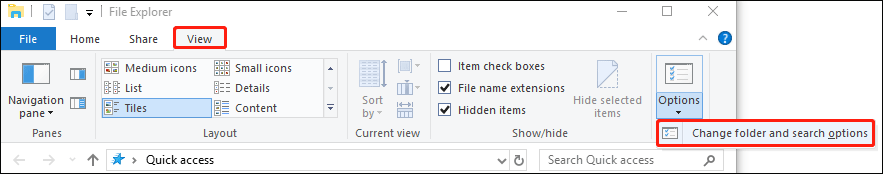 Step 2: Go to the View tab, and then select Options > Change folder and search options.