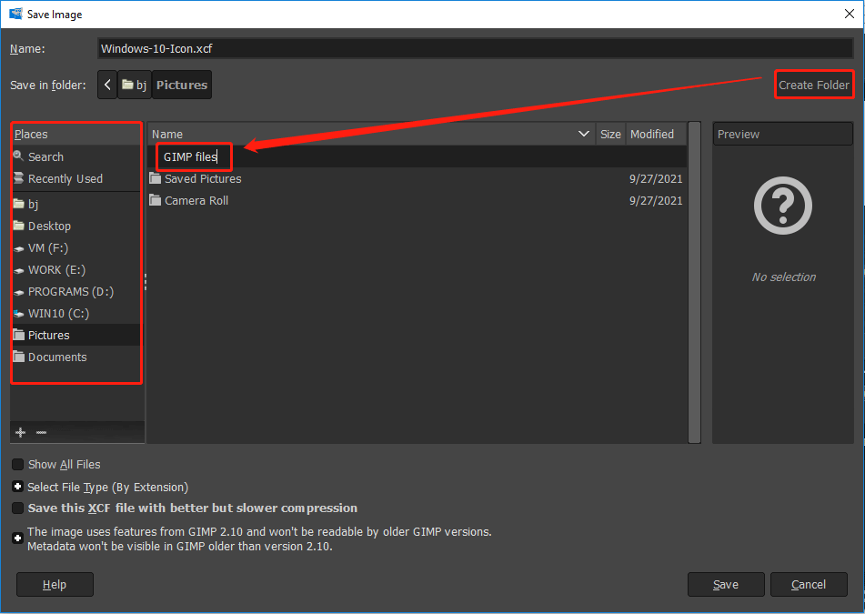 Step 2: Select a location and create a new folder for your GIMP files.