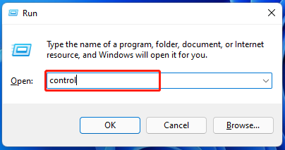 Step 1. Press Win + R keys to open the Run dialog box, and then type control in the box and hit Enter.