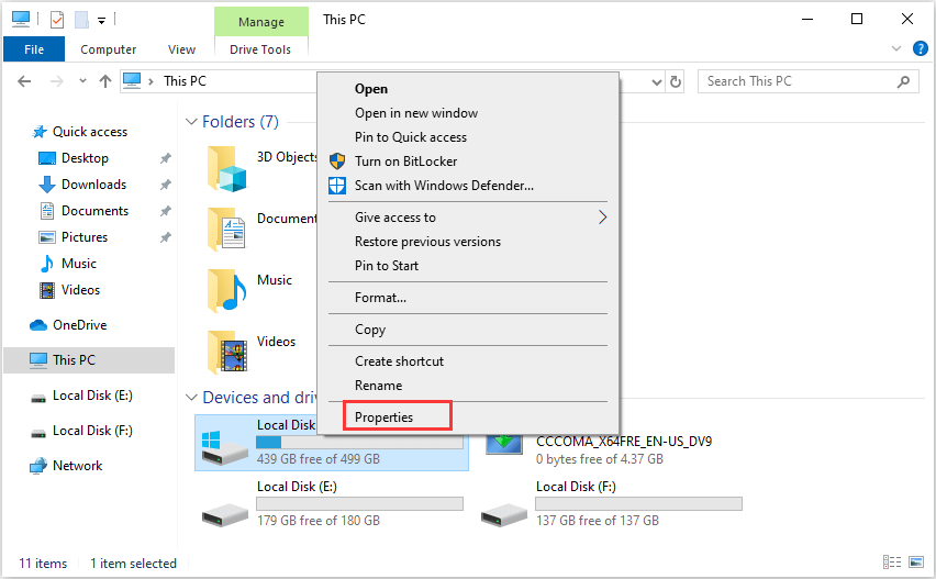 Step 2: In the Devices and drives section, right-click one of the drives and choose Properties.