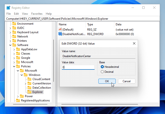 Step 5: Right-click DisableNotificationCenter and select Modify. In the pop-up window, change the Value data to 0.