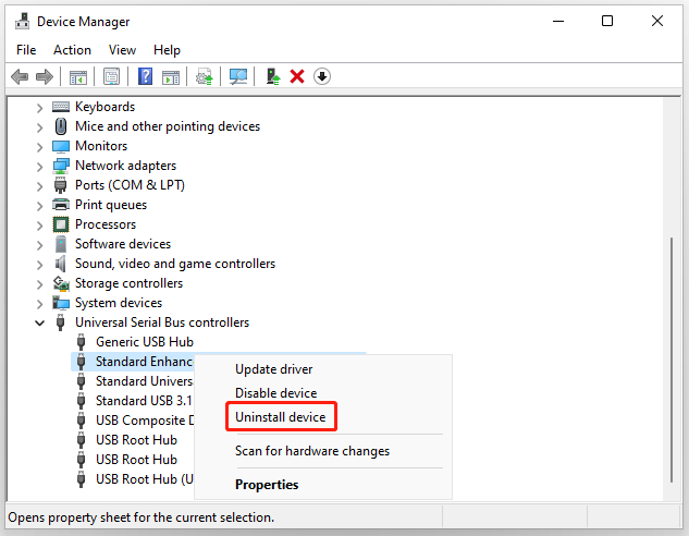 Step 3: Follow the on-screen instructions to uninstall the driver successfully. Then right-click Universal Serial Bus controllers and select Scan for hardware changes to reinstall the driver.