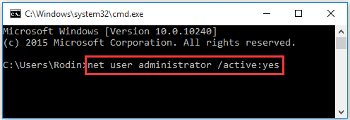 Step 2. Type net user administrator /active:yes in the elevated Command Prompt window and hit Enter to activate the administrator account.