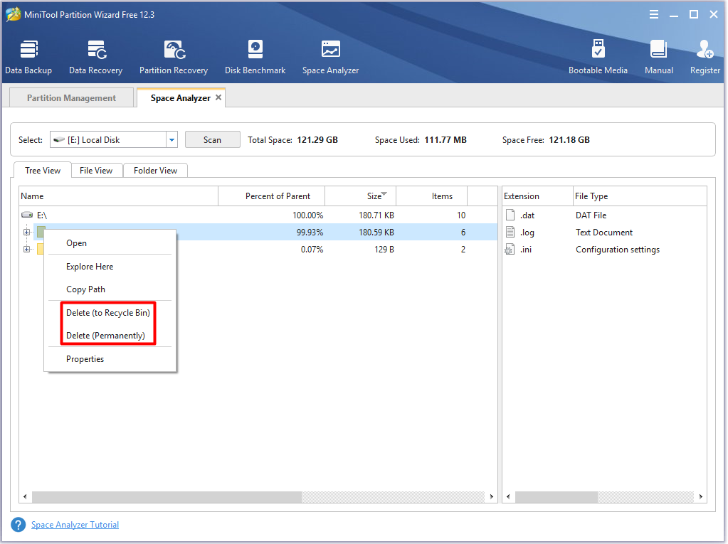 Step 3: After a while, you will see the scan result. It shows you the exact disk usage and percent of parent of each file. In this way, you can view what’s taking up your space clearly. To delete space-consuming and useless files, right-click on them one by one and click the Delete option.