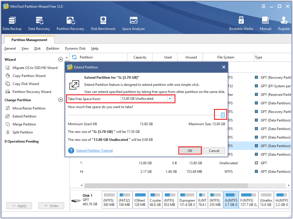 Step 2: Click the down arrow from “Take Free Space From” and select the unallocated partition to get expansion space. You can drag the sliding handle to decide how much of the available space it takes up. Then click OK to return to the main interface.