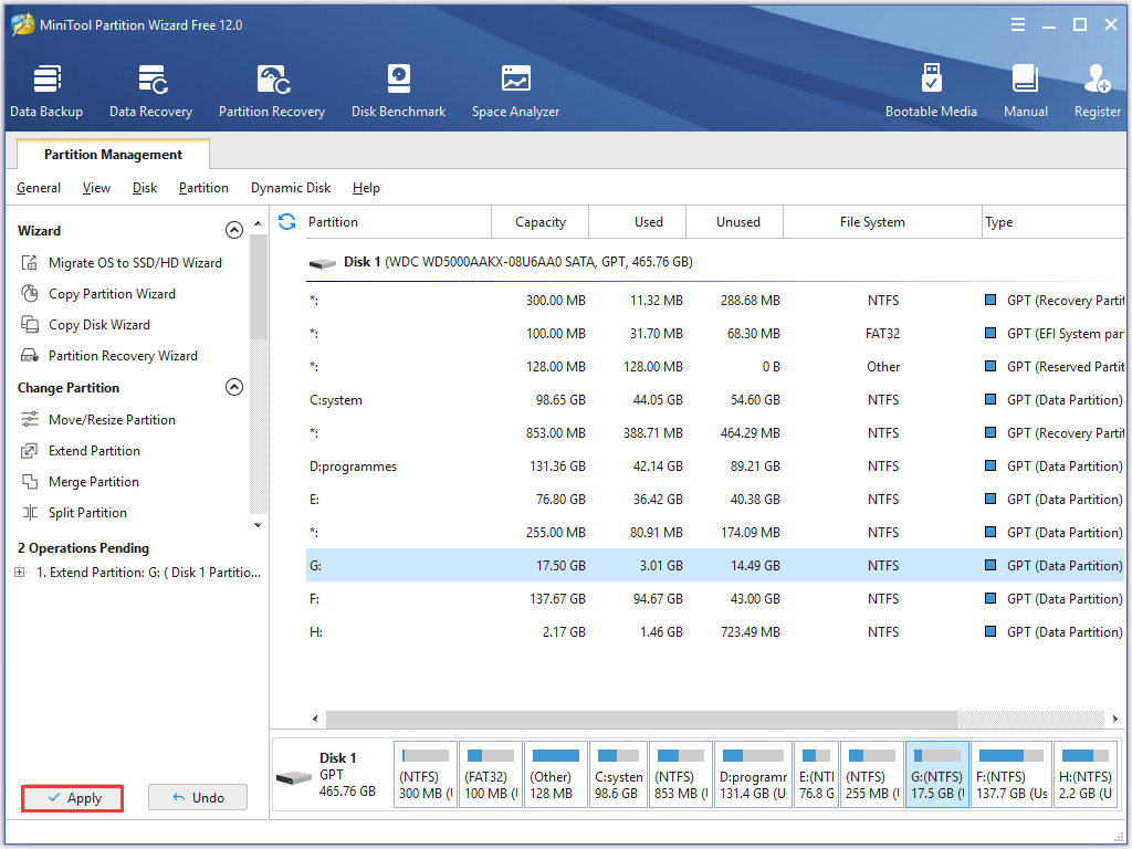 Step 3: You can see that the F partition has been expanded to a non-contiguous space. But it has not been applied to the computer yet, so you need to click the Apply button to perform all changes.