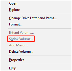 If the function is in the state like the above image, you can directly choose it and follow the on-screen instructions to shrink the volume. But if you find Shrink Volume is greyed out like the following image, you need to make some changes to make it available.